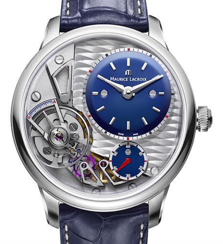 Maurice Lacroix Masterpiece Gravity model MP6118-SS001-434-1. Baselworld 2014 Novelty. Limited Edition of 250 pieces. Maurice Lacroix Automatic Manufacture Calibre ML230. Partialy open dial with off-centre hours and minutes display, small seconds platform at 4 o`clock covered by sapphire crystal. Satin and polished steel case. Blue crocodile strap.