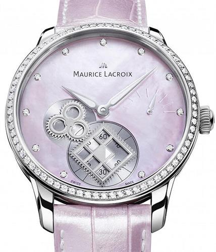 Maurice Lacroix Masterpiece Roue Carree Seconde square wheel model MP7158-SD501-570. Swiss manual-wind movement. Square and clover-shaped wheels on the pink Mother-of-Pearl dial. Square wheel serves as a hand on seconds sub-dial. See-through case back covered by sapphire crystal. Steel hands with Superluminova. Satin and polished case with diamonds on the bezel. Pink crocodile strap.