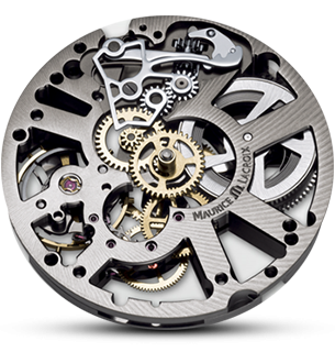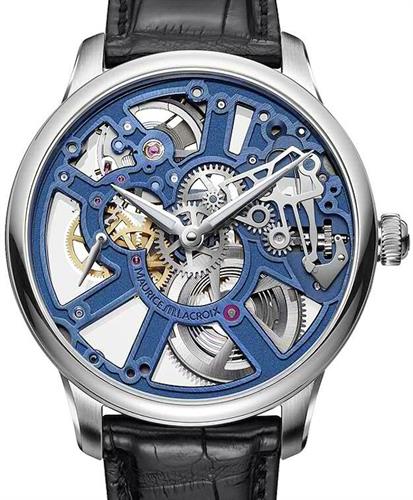 Maurice Lacroix Masterpiece Squelette model MP7228-SS001-004-1. Swiss manual-wind skeletonized movement in blue color execution. The bridges, disks, the wheels, and pinions of the mechanism are at full view. See-through dial and case back covered by sapphire crystal. Steel luminous hands. Satin and polished case. Black crocodile strap.