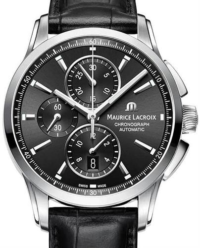 Maurice Lacroix Pontos Chronographe model PT6388-SS001-330-1. Swiss automatic ETA Valjoux 7750 based movement. Satin and polish finished stainless steel case with black leather strap. Decorated crown. Black dial with date calendar, luminous hands and markers with Superluminova. Water resistant to 100 meters.