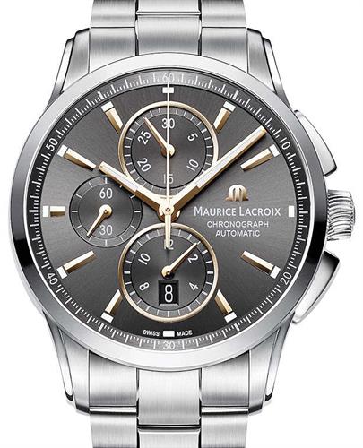 Maurice Lacroix Pontos Chronographe model PT6388-SS002-331-1. Swiss automatic ETA Valjoux 7750 based movement. Satin and polish finished stainless steel case with bracelet. Decorated crown. Grey dial with rose gold outlined sub-dials, date calendar, luminous hands and markers with Superluminova. Water resistant to 100 meters.