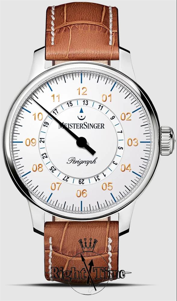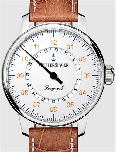 MeisterSinger "Perigraph" white dial automatic single hand model with disc calendar powered by ETA2824-2 25 jewel movement inside polished 43mm stainless steel case