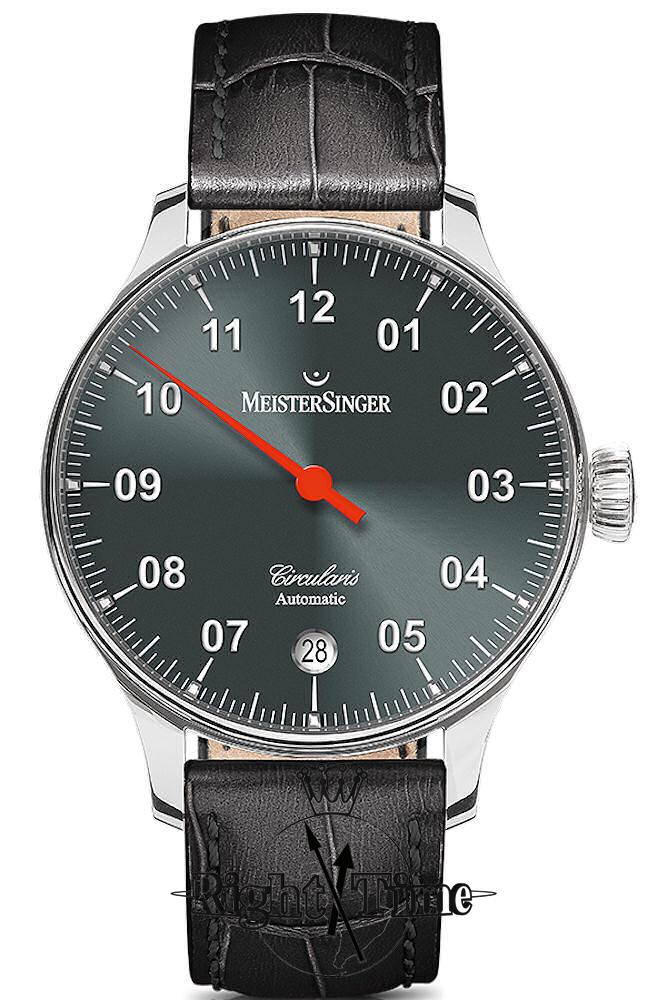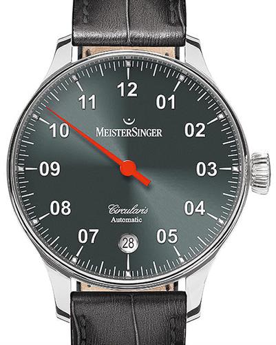 MeisterSinger Circularis model CC907. Single hand operation with date window. Powered by manufactured MSA01 29 jewels automatic movement with 120 hour power reserve. Beautiful sunburst Anthracite dial in a solid stainless steel case with observation caseback. Black alligator strap with deployant buckle.