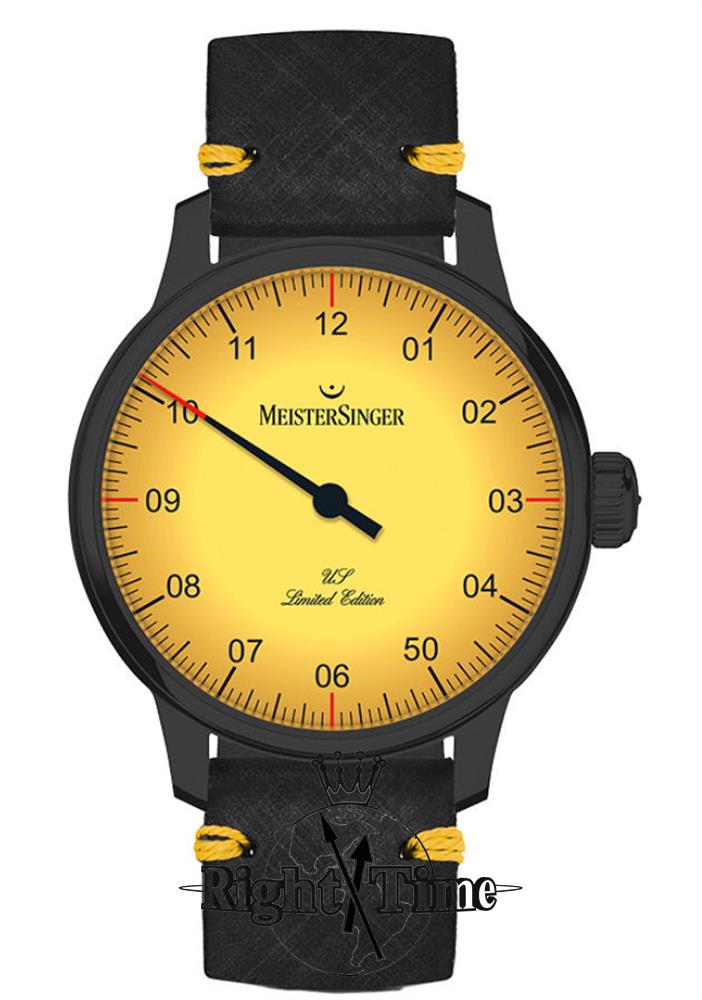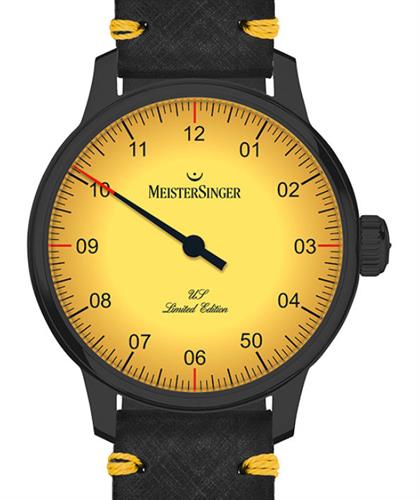 MeisterSinger USA Limited Edition Mellow Yellow model ED-USA-AM905BL. Single hand automatic movement with Yellow dial and Arabic double digit black numerals. Black steel case with exhibition back and black leather band. Limited Edition of 50 pieces