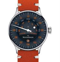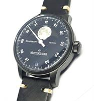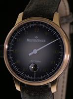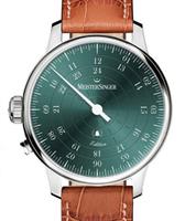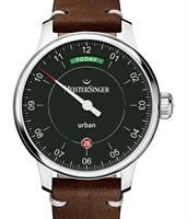 Meistersinger Urban Day Date model Edition Today. Limited to 100 pieces. Steel 40mm case. Black dial with Arabic numerals, green day window display that will teach you how to say "today" in seven different languages (English, German, French, Dutch, Spanish, Italian and Esperanto), and red date. Powered by MIYOTA 8285 automatic single hand movement. Brown brown leather strap.