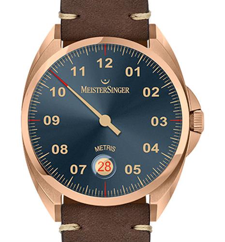 MeisterSinger "Metris" single hand model with blue dial. Powered by automatic ETA 2824-2 movement inside of bronze 38mm case