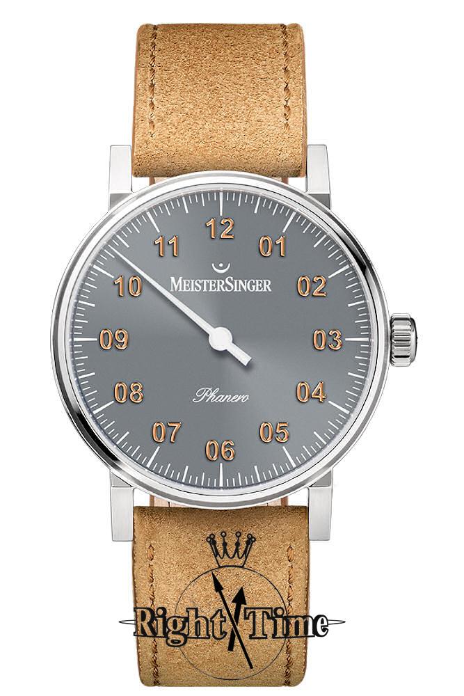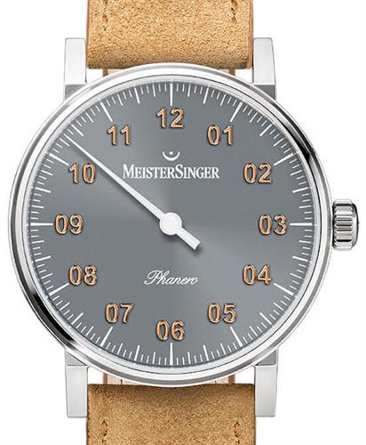MeisterSinger "Phanero" single hand model with sunburst anthracite dial and golden appliques. Powered by manual-wound Sellita SW 210 movement inside polished 35mm stainless steel case