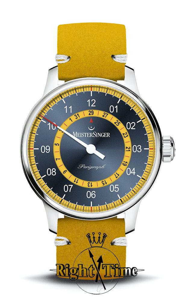 MeisterSinger Perigraph Mellow Yellow automatic single hand model with disc calendar powered by Sellita SW 200 movement inside polished 43mm stainless steel case. Limited edition of 200 pieces