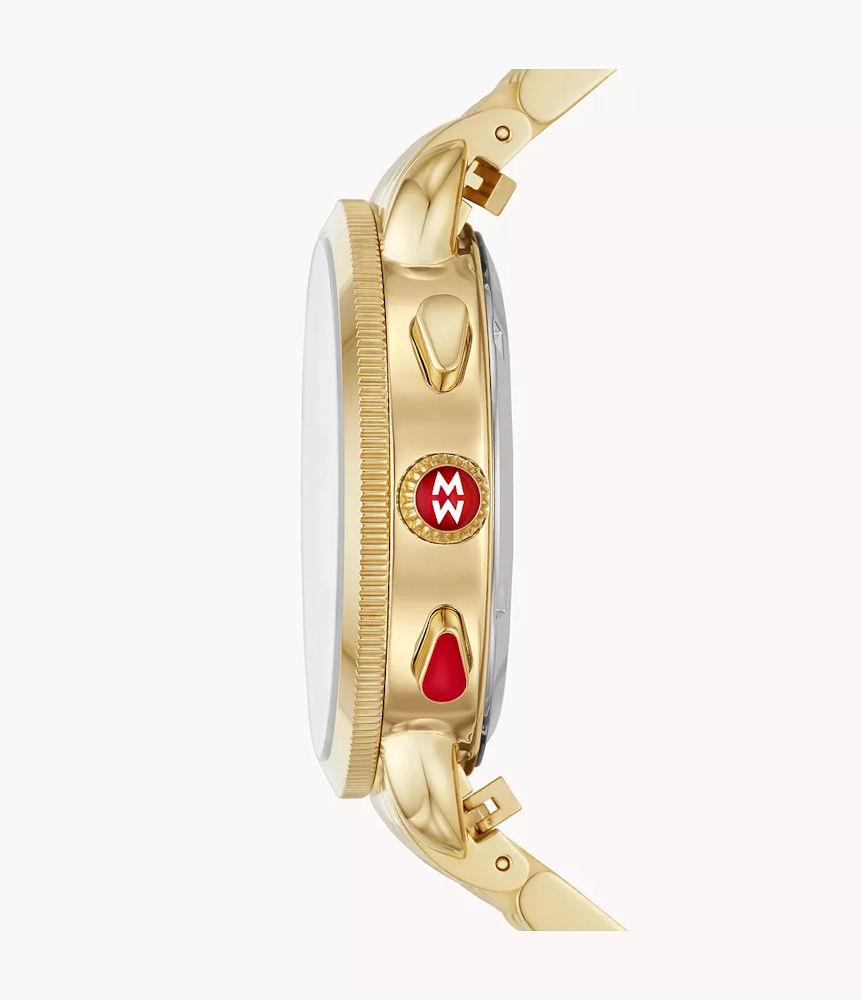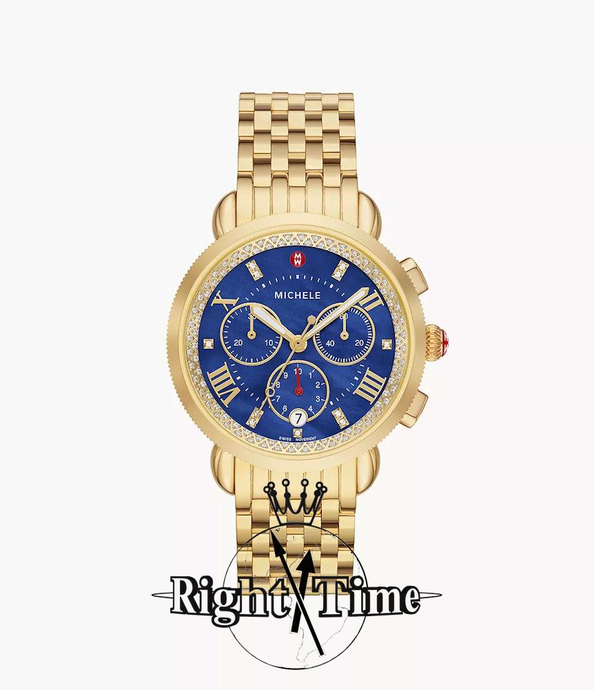 Michele Sport Sail Gold Diamond Stainless Steel Watch. Quartz chronograph movement. Stainless steel 18k gold plated case and bracelet. 96 diamond set (0.33 carat) on bezel and dial. Blue cobalt Mother-of-Pearl dial with diamond and Roman markers. Water resistant to 50 meters.
