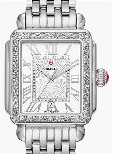 Michele Deco Madison Mid model MWW06G000001. High polished stainless steel case and bracelet. Brilliant 148 hand-set diamonds on the bezel and atop the silver white sunray dial. Sapphire crystal. Water resistant to 50 meters. Swiss quartz analog movement.