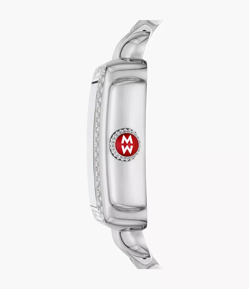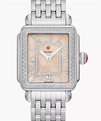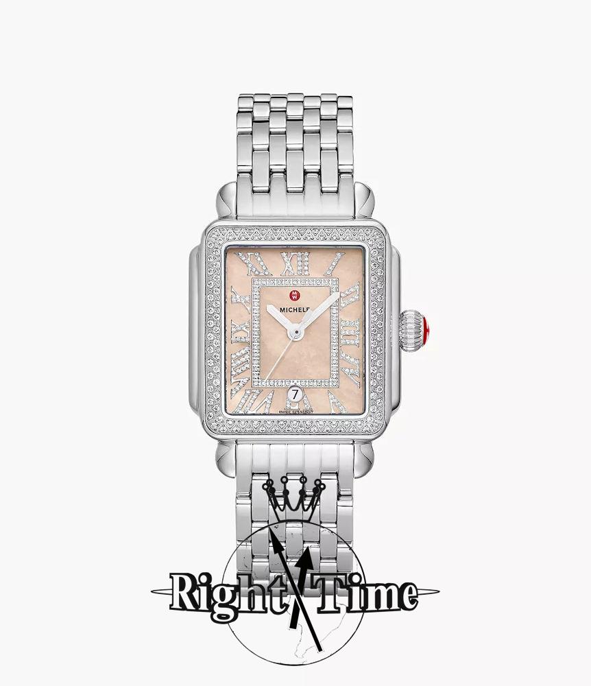 Michele Deco Madison Stainless Steel Diamond Watch. Quartz movement. Stainless steel tank style case with bracelet. 263 diamonds (0.8600 carat total) on the bezel and orange Mother-of-Pearl dial. Water resistant to 50 meters.
