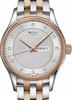 Mido Belluna collection. Model M001.230.22.036.91. Swiss ETA 2678 automatic movement with day/date calendars. Stainless steel case and watch bracelet with rose gold plated accents. Silver color dial with diamond markers.
