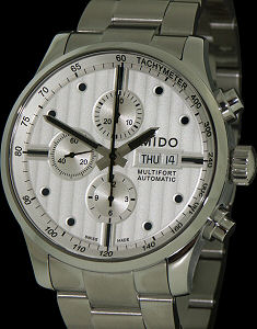 Mido Multifort collection. Model M005.614.11.031.00. Swiss ETA/VALJOUX 7750 automatic chronograph movement with day/date calendars. Stainless steel case and watch bracelet. Silver textured dial with tachymeter scale.