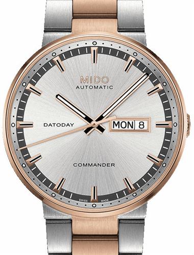 Mido Commander II Automatic Model M014.430.22.031.00. Swiss ETA 2836 automatic movement with day/date calendars. Stainless steel case and solid link bracelet with rose gold tone plated accents. Silver color dial.
