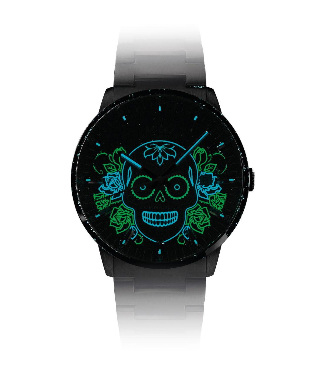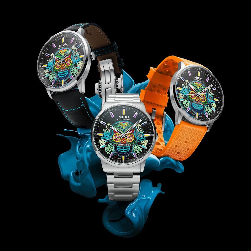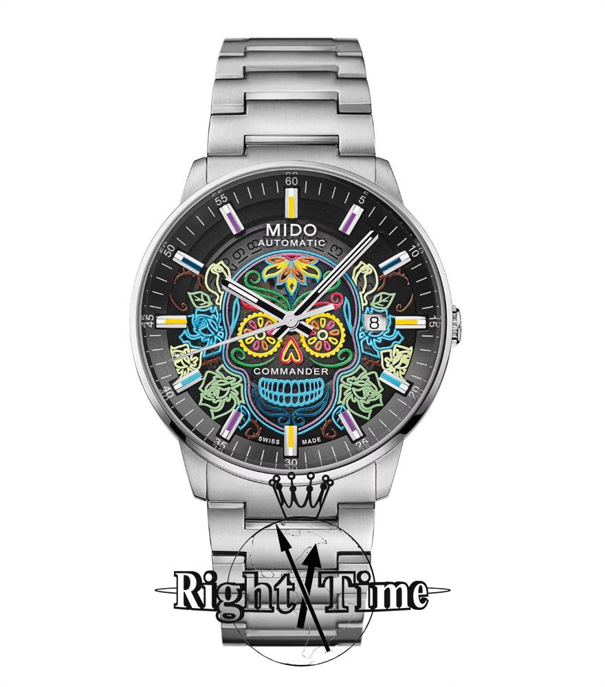 Mido Commander Gradient Catrines Automatic Model M021.407.11.411.04. Sixth edition of MIDO`s tribute to Mexican cultural identity. Commander Gradient Catrines is the latest creation in this iconic collection dedicated to the Día de Muertos (The Day of the Dead). Swiss ETA C07.611 based automatic movement with date calendars. Stainless steel case and bracelet. Black transparent dial with iconic skull surrounded by flowers. Comes as Special Edition with 2 extra straps