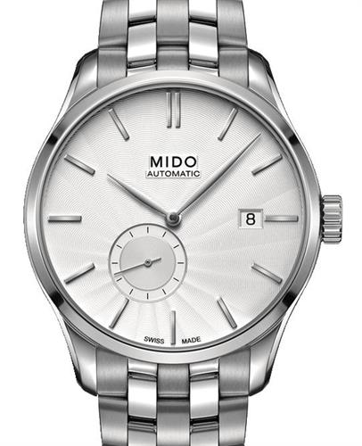 Mido Belluna II collection. Model M024.428.11.031.00. Swiss ETA 2825-2 automatic movement. Stainless steel case and watch bracelet. Silver color textured dial with date calendar and small seconds sub-dial. Water resistant to 50 meters