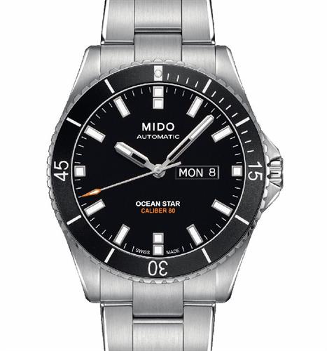 Mido Ocean Star 200, factory model M026.430.11.051.00. Powered by a Mido Caliber 80 (base ETA C07.621) automatic movement. Water-resistant to 20 bar (200 m / 660 ft). Stainless steel case, black uni-directional bezel, black dial with luminous markers and day/date calendar.
