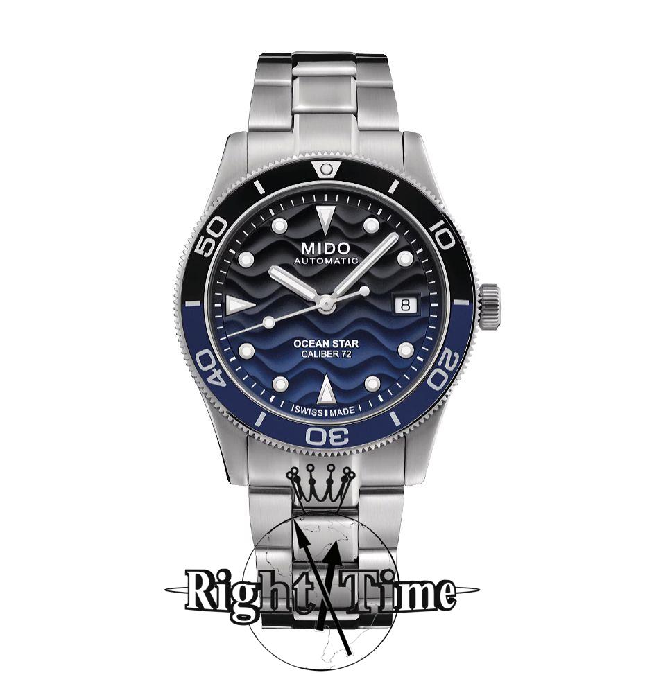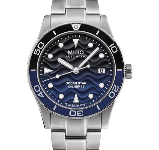 Mido Ocean Star 39, factory model M026.907.11.041.00. Powered by a Mido Caliber 72 automatic movement. Water-resistant to 20 bar (200 m / 660 ft). Stainless steel case, blue gradient uni-directional bezel and textured dial with luminous markers and date calendar.