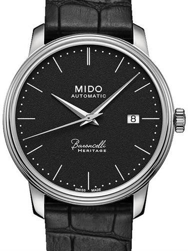 Mido Baroncelli III Heritage automatic watch. Model M027.407.16.050.00. Swiss ETA 2892-2 automatic movement with date calendar. Slim 39mm stainless steel case with black leather band. Black dial. Sapphire crystal.