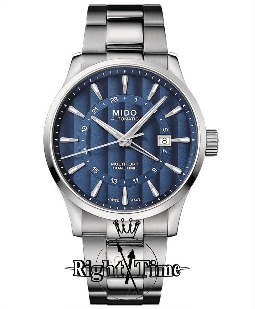 Mido Multifort collection dual time GMT model M038.429.11.041.00. Swiss made Mido Caliber 80 automatic movement with date and GMT functions. Solid stainless steel case and bracelet. Blue dial with Geneva stripes and luminous hands/markers. Domed sapphire crystal with anti-glare treatment. Water resistant to 100 meters.