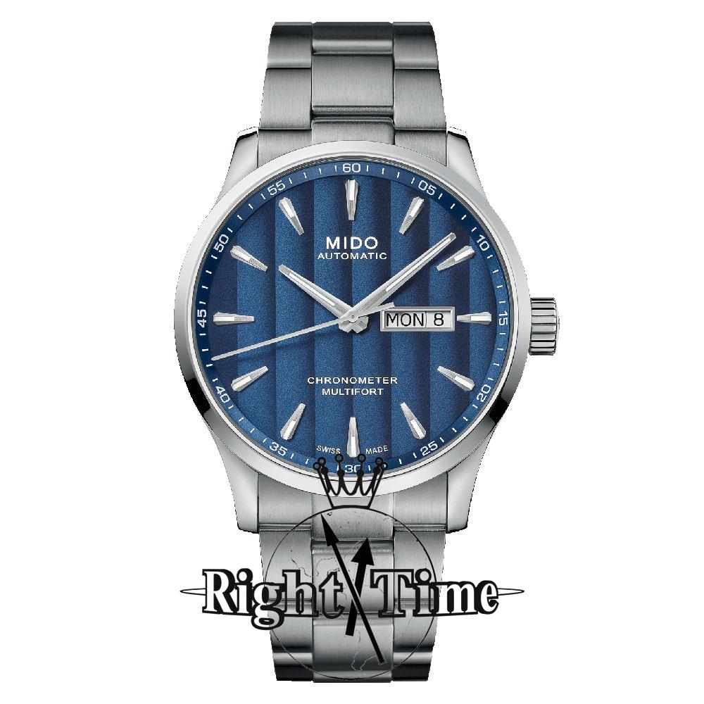 Mido Multifort collection, factory model M038.431.11.041.00. Mido Swiss made Caliber 80 Automatic movement with COSC Chronometer certification. Stainless steel case. Blue dial with Geneva stripes and luminous markers. Metal bracelet