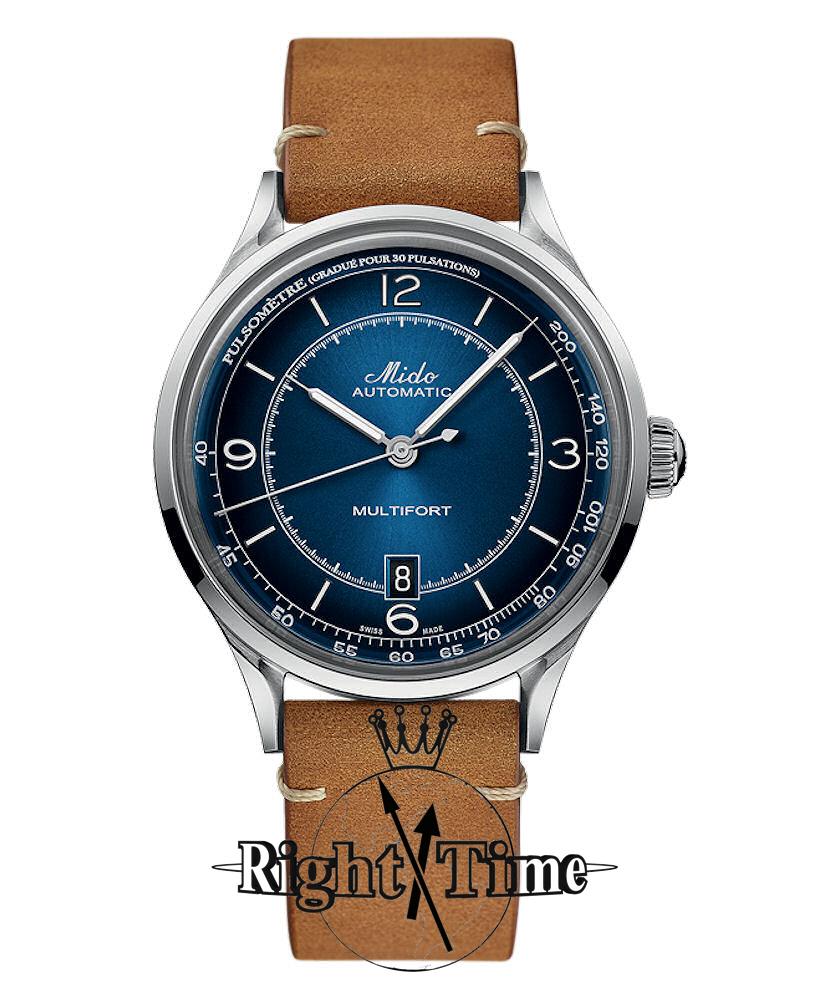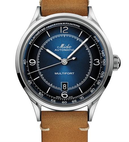 Mido Multifort Patrimony collection, factory model M040.407.16.040.00. Mido Swiss made Caliber 80 Automatic movement. Stainless steel case. Observation back. Blue dial. Tan color leather band.