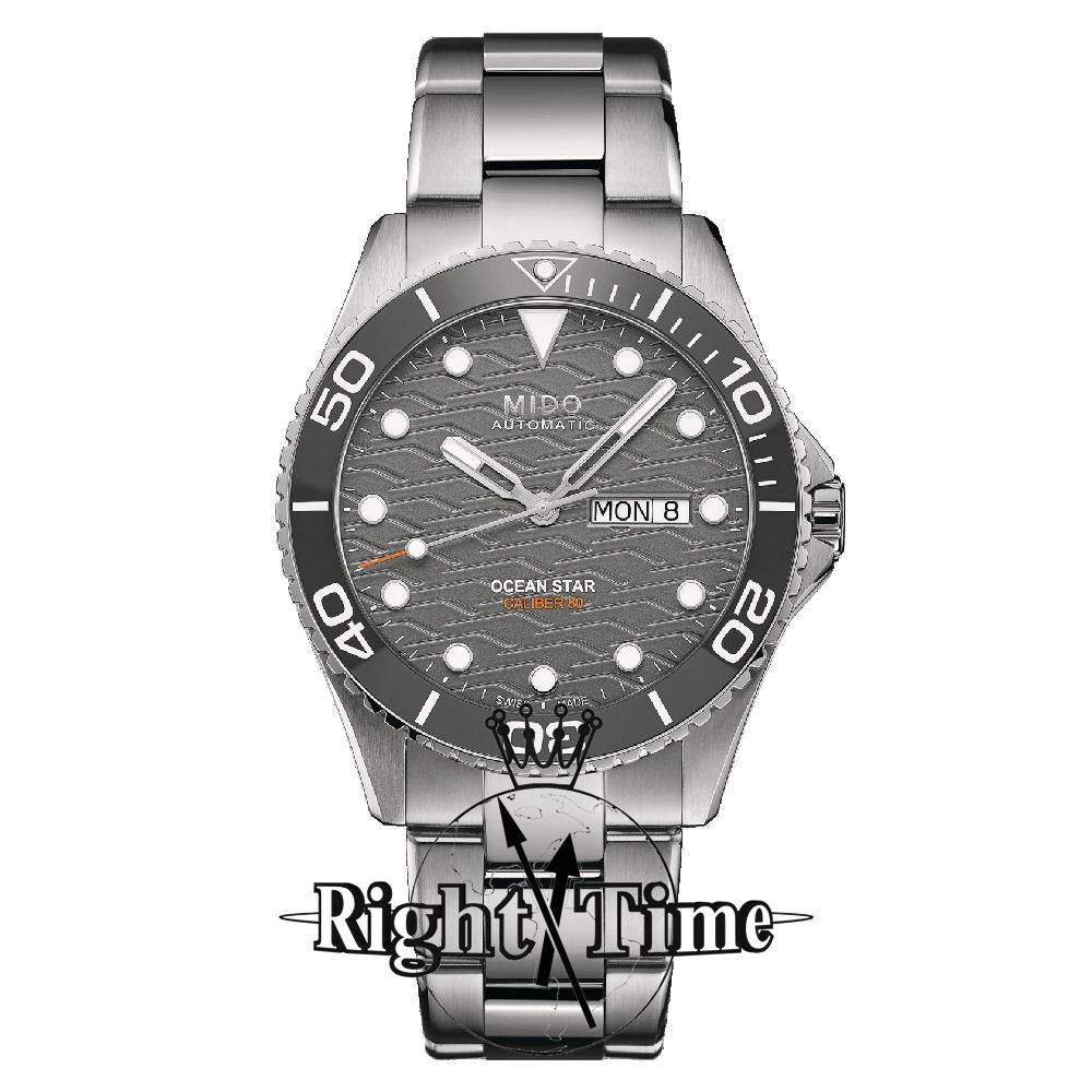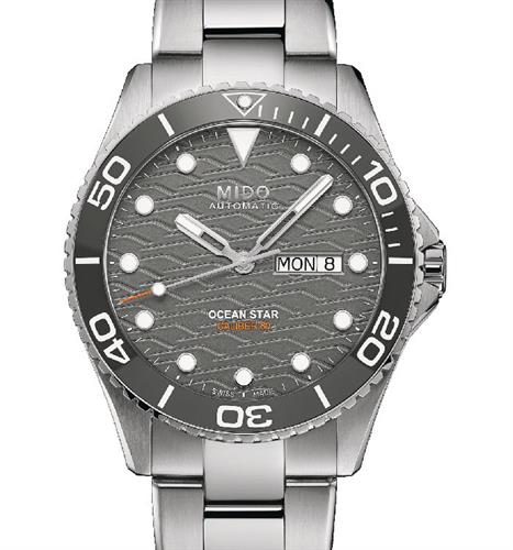 Mido Ocean Star 200, factory model M042.430.11.081.00. Powered by a Mido Caliber 80 (base ETA C07.621) automatic movement. Water-resistant to 20 bar (200 m / 660 ft). Stainless steel case, grey uni-directional bezel, grey textured dial with luminous markers and day/date calendar.
