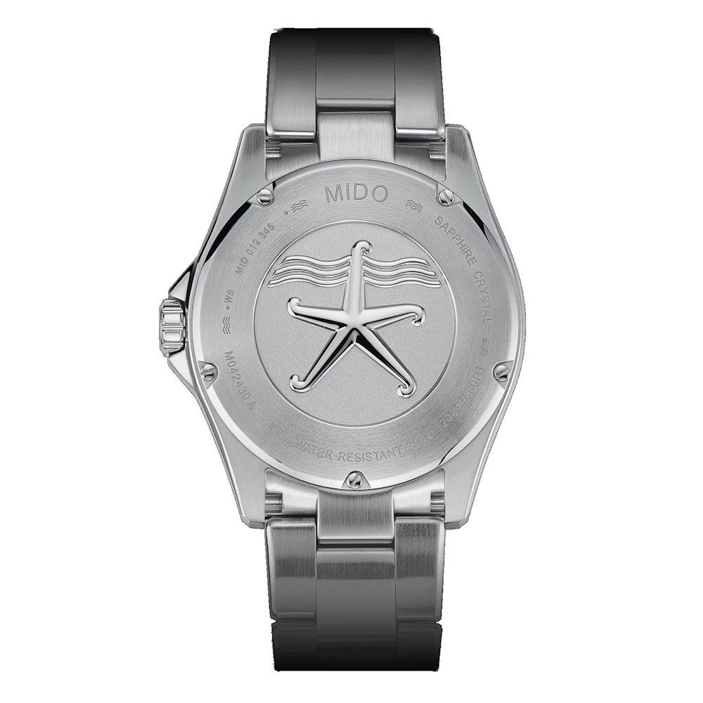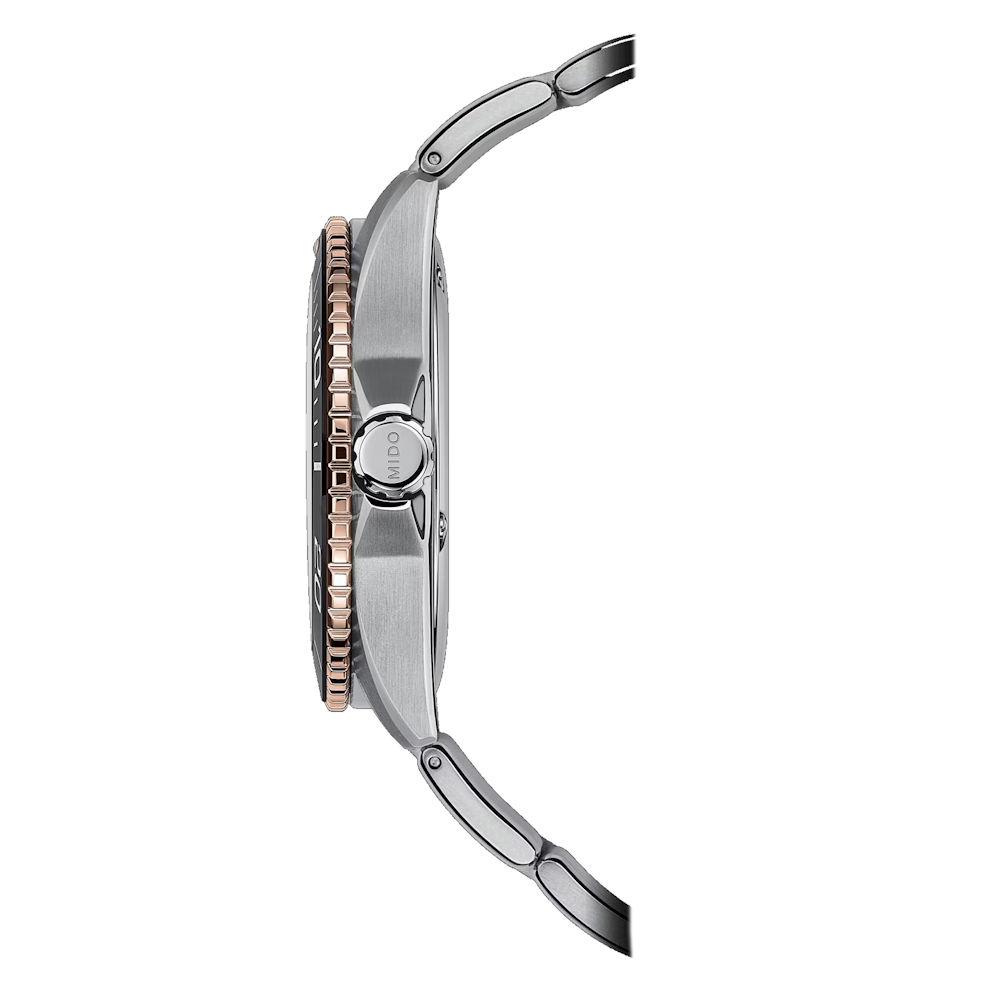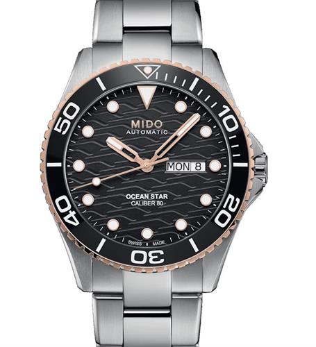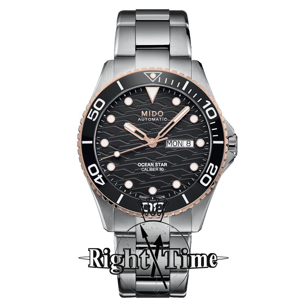 Mido Ocean Star model M042.430.21.051.00. Stainless steel case and bracelet. Textured black dial with luminous hands and markers. Rose gold tone plated uni-directional rotating bezel with black ceramic 60 minute insert. Swiss made Mido Caliber 80 automatic with day/date and 80 hour power reserve. Anti-glare coating sapphire crystal. Water resistant to 20bar.