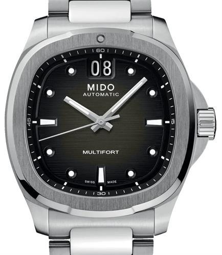 Mido Multifort TV model M049.526.11.081.00. The cult classic TV shape case returns to Mido`s catalog 50 years after it was first introduced in 1973. Solid stainless steel case and bracelet. Anti-reflective sapphire crystal. Powered by the Mido Caliber 80 automatic movement with big date calendar and an 80 hour power reserve. Textured gradient grey dial with luminous steel tone hands and markers.
