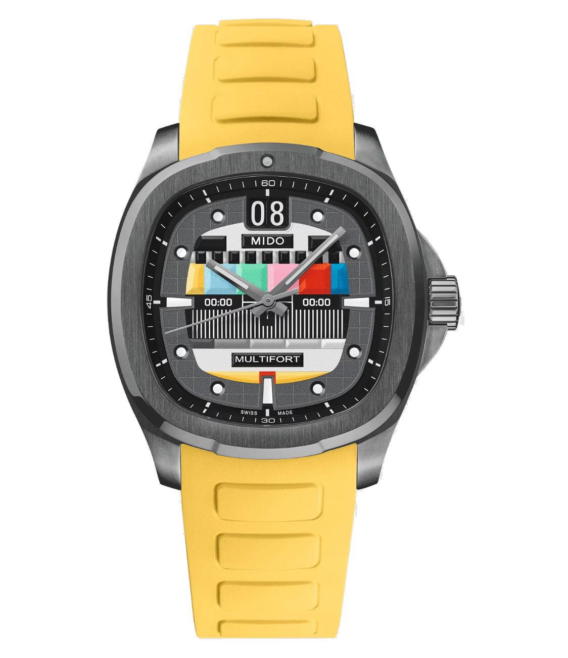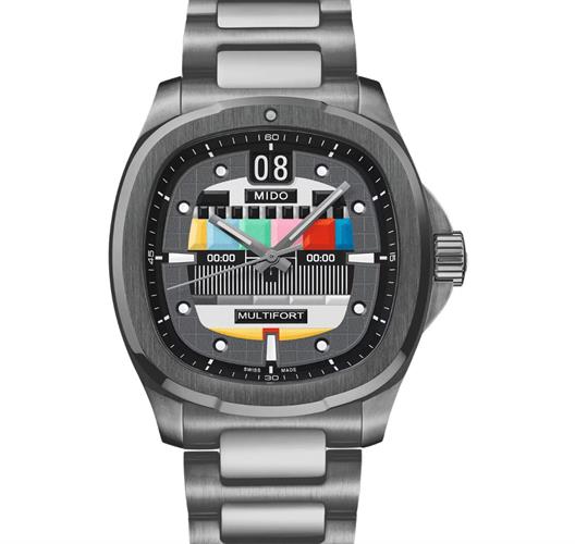 Mido Multifort TV model M049.526.33.081.01. Special edition with 2 extra straps. The cult classic TV shape case returns to Mido`s catalog 50 years after it was first introduced in 1973. Stainless steel case and bracelet with anthracite PVD coating. Anti-reflective sapphire crystal. Powered by the Mido Caliber 80 automatic movement with big date calendar and an 80 hour power reserve. Textured gradient grey dial with "TV color calibration" screen design, luminous steel tone hands and markers.