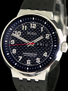Mido All Dial collection. Model M8340.4.D8.91. Swiss ETA 2836-2 automatic movement with day/date calendars. Polished stainless steel case with rubber band. Black carbon fiber dial with Arabic markers.
