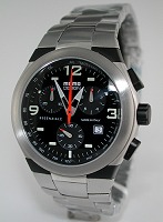 Date calendar, window display. 30 min, 60 sec, 1/10 sec registers chronograph.