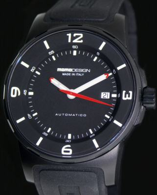 Momo Pilot Series, Model MD165. ETA 2824 Automatic movement. Solid stainless steel case and clasp with a black PVD finish. Black genuine rubber band, with embossed company logo. Black color dial with luminous markers, numerals, and hands. 100 meters water resistant and a sapphire crystal.