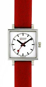 Mondaine wrist watch model 94116 from Mondaine Evo Collection. Swiss quartz movement, small polished square stainless steel case, red leather watch band. Official Swiss Railway Watch Design, white dial with black hands and indexes.