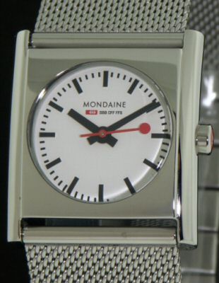 Mondaine Evo "Cube" wrist watch model from Mondaine Evo Collection. Swiss quartz movement, polished rectangular stainless steel case, steel mesh style watch bracelet with butterfly clasp. Official Swiss Railway Watch Design, white dial with black hands and indexes.