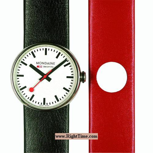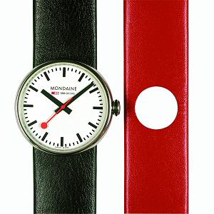 Mondaine 60th Anniversary wrist watch model 94161. Swiss quartz movement, polished stainless steel case, two leather watch bands - one red and one black. Official Swiss Railway Watch Design, white dial with black hands and indexes. Comes in special box.