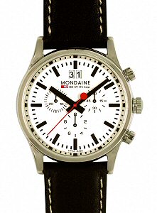 Mondaine chronograph watch model 94202. Swiss quartz chronograph movement with Big Date calendar at 12 o`clock position, polished stainless steel case, black leather watch band with white stitching. Official Swiss Railway Watch Design, white dial with black hands and indexes.