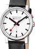 Mondaine wrist watch model A468.30352.11SBB. Swiss quartz movement with alarm, polished stainless steel case, black leather watch band. Official Swiss Railway Watch Design, white dial with black hands and indexes.
