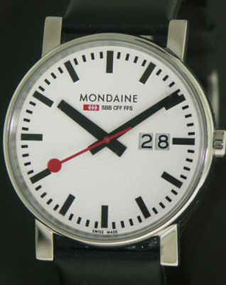 Mondaine Evo Swiss Railways quartz A627.30303.11SBB. Big 40mm size, Big Date, polished stainless steel case, white dial