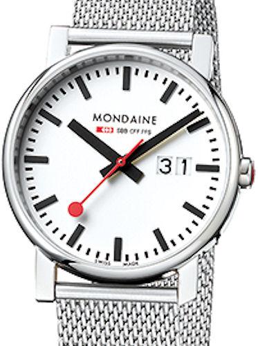 Mondaine Evo Swiss Railways quartz A627.30303.11SBM. Big 40mm size, Big Date, polished stainless steel case, white dial, steel mesh bracelet