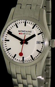 Mondaine wrist watch model A629.30341.16SBM from Mondaine Sport line. Swiss quartz movement with date calendar, satin finished stainless steel case and bracelet, sapphire crystal. Official Swiss Railway Watch Design, white dial with black hands and indexes.