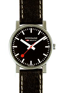 Mondaine wrist watch model A658.30300.14SBO from Mondaine Evo Collection. Swiss quartz movement, brushed stainless steel case, black leather watch band. Official Swiss Railway Watch Design, black dial with white hands and indexes.