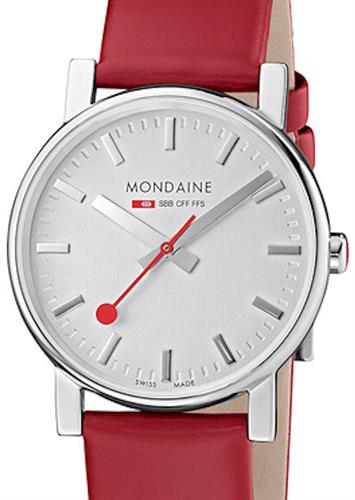 Mondaine wristwatch model A658.30300.18SBC from Mondaine Evo Tone-on-Tone Collection. Swiss quartz movement, polished stainless steel case, red leather watch band. Silver dial with steel hands and indexes.