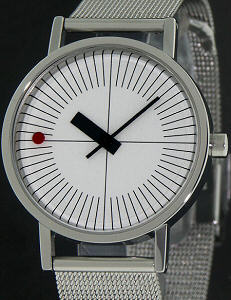 . Round stainless steel case, quartz movement. White dial with black hands and red moving dot as a seconds hand. Case back is signed by Mario Botta.