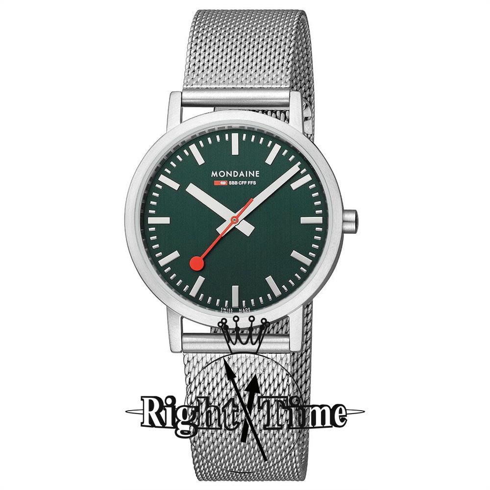 Mondaine wrist watch model A660.30314.60SBJ from Mondaine Classic Collection. Swiss quartz movement, brushed stainless steel case, mesh steel watch bracelet. Official Swiss Railway Watch Design, green dial with white hands and indexes.