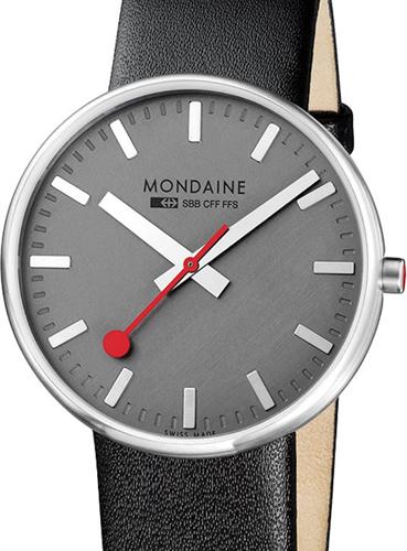 Mondaine Giant wrist watch model A660.30328.15SBB. Swiss quartz movement, brushed stainless steel case, black leather watch band. Official Swiss Railway Watch Design, anthracite color dial with steel hands and indexes.