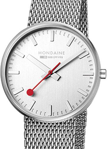 Mondaine Giant wrist watch model A660.30328.16SBM. Swiss quartz movement, stainless steel case with mesh bracelet. Official Swiss Railway Watch Design, silver color dial with steel hands and indexes.