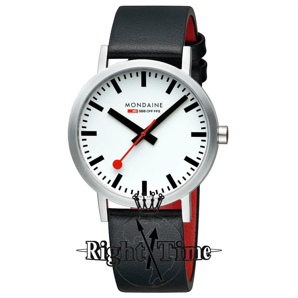 40mm Mondaine wrist "Classic" model A660.30360.16SBBV in satin finish stainless steel case. White dial with black markers. Comes with a black leather watch band.