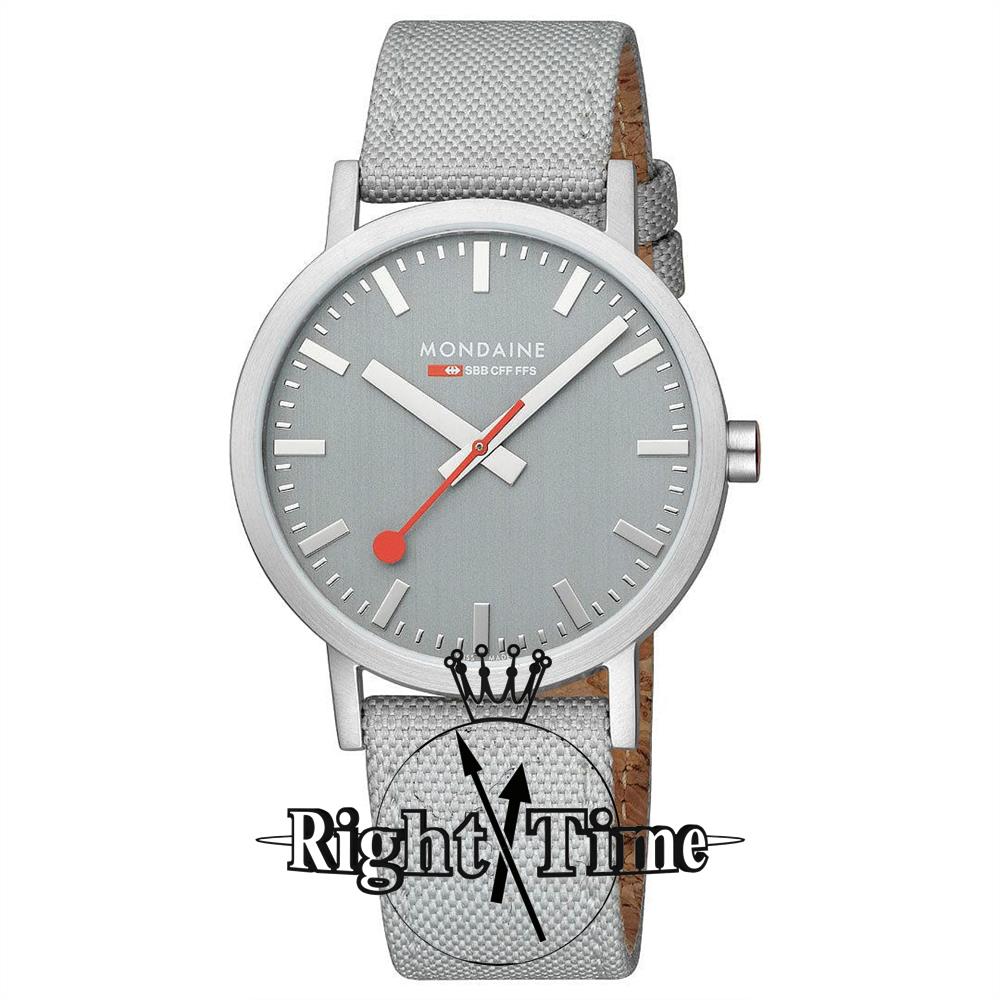 40mm Mondaine wrist "Classic" model A660.30360.80SBH in satin finish stainless steel case. Grey dial with white markers. Comes with a grey textile watch band from recycled PET Bottles with cork lining.