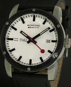 Mondaine wrist watch model A667.30338.11SBB from Mondaine Sport II Day Date Collection. Swiss quartz movement with date and day calendar, satin finished stainless steel case with black plated bezel, sapphire crystal, white textured dial, black leather watch band. 100 meters water resistant. Official Swiss Railway Watch Design.